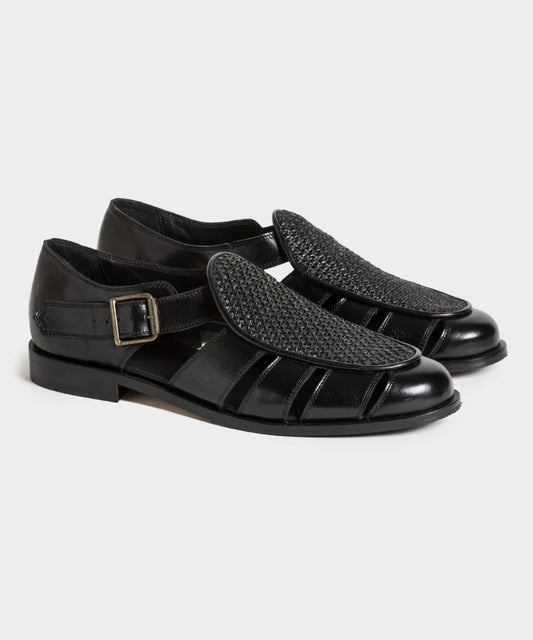 Jacques Solovière's Fisherman sandals combine the classic charm of black leather with the unique texture...