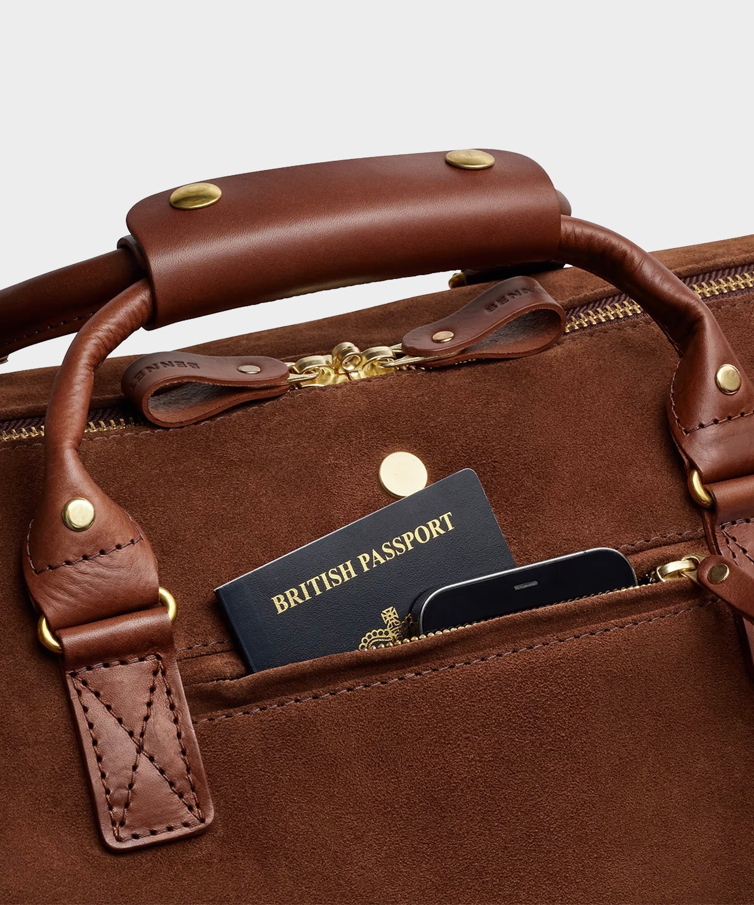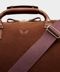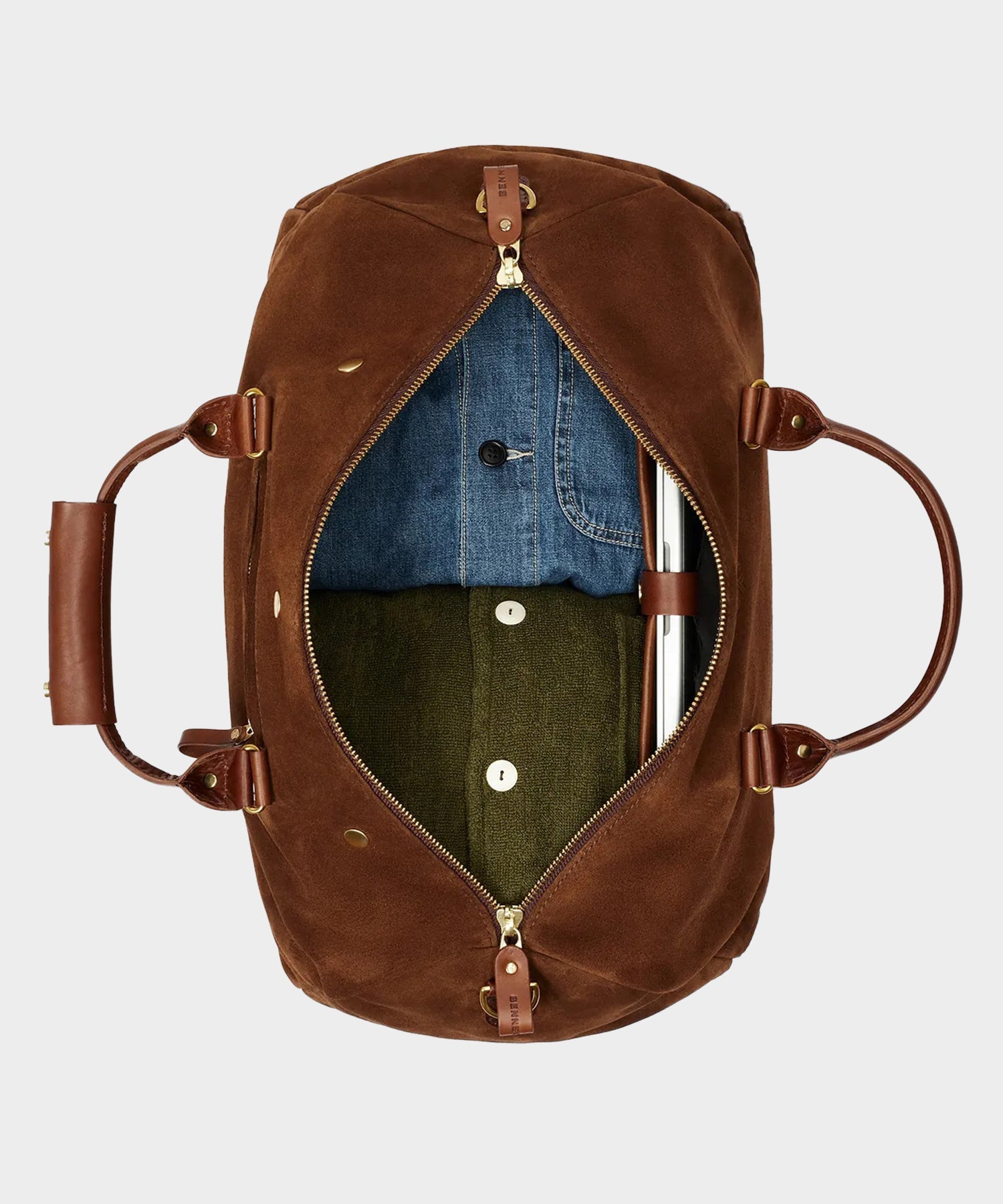 Diese wasserdichte Reisetasche wird in England aus italienischem Moos-Veloursleder handgefertigt und bewahrt den reichen Charakter von aufgerautem Wildleder, während sie robuste Funktionalität bietet. Sie verfügt über ein vollständig gepolstertes Laptopfach, eine herausnehmbare wasserdichte Schuh-/Sporttasche und eine Nass-Tasche, um die Ausrüstung organisiert zu halten. Für Reisen konzipiert, umfasst sie Griffe aus vegetabil gegerbtem toskanischem Leder, einen abnehmbaren Baumwoll-Schultergurt in Militärqualität mit massiven Messingverschlüssen und massive Messing-Standfüße zum Schutz. Eine verdeckte Außentasche hält Ihren Reisepass oder Ihr Telefon griffbereit.