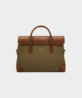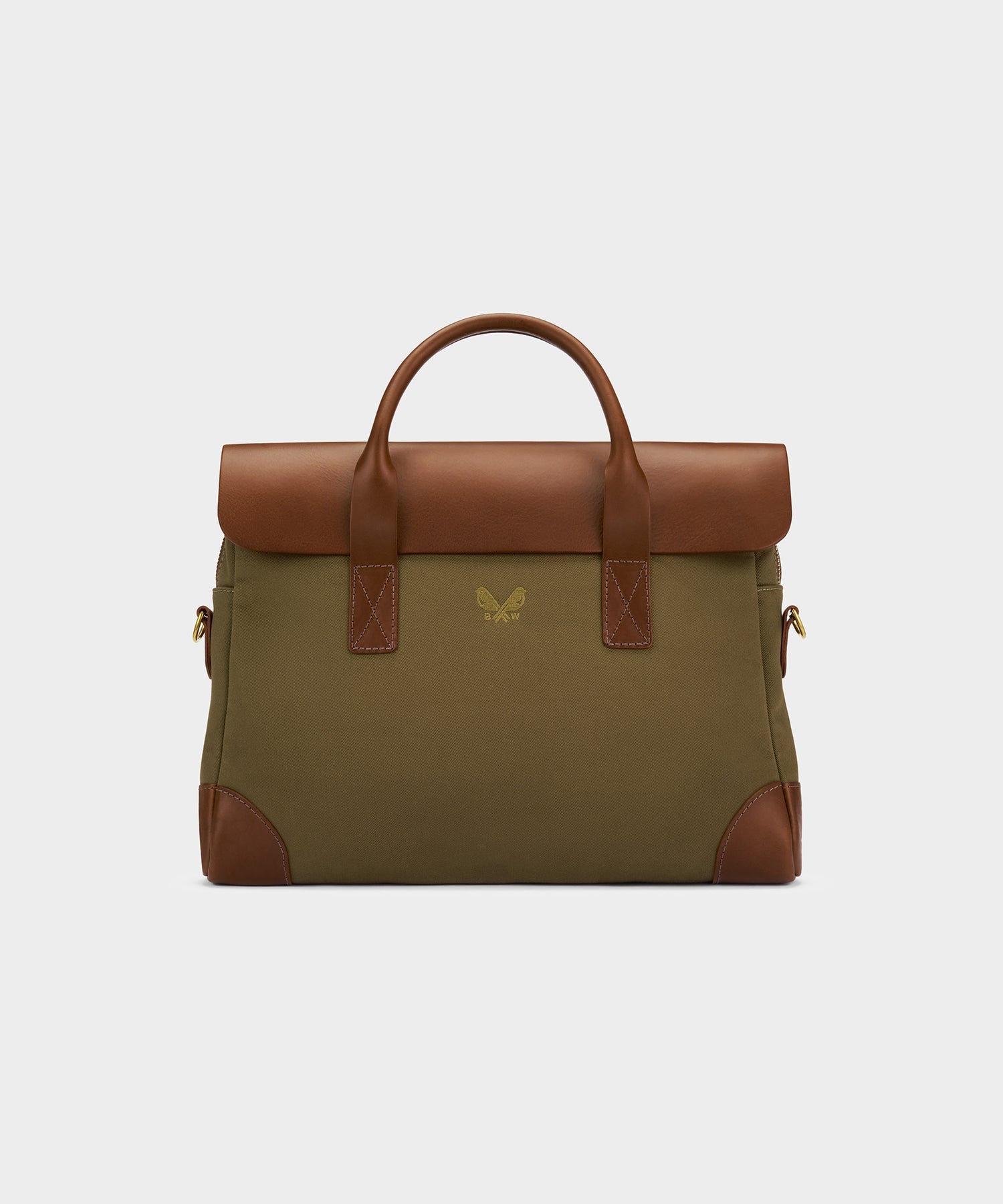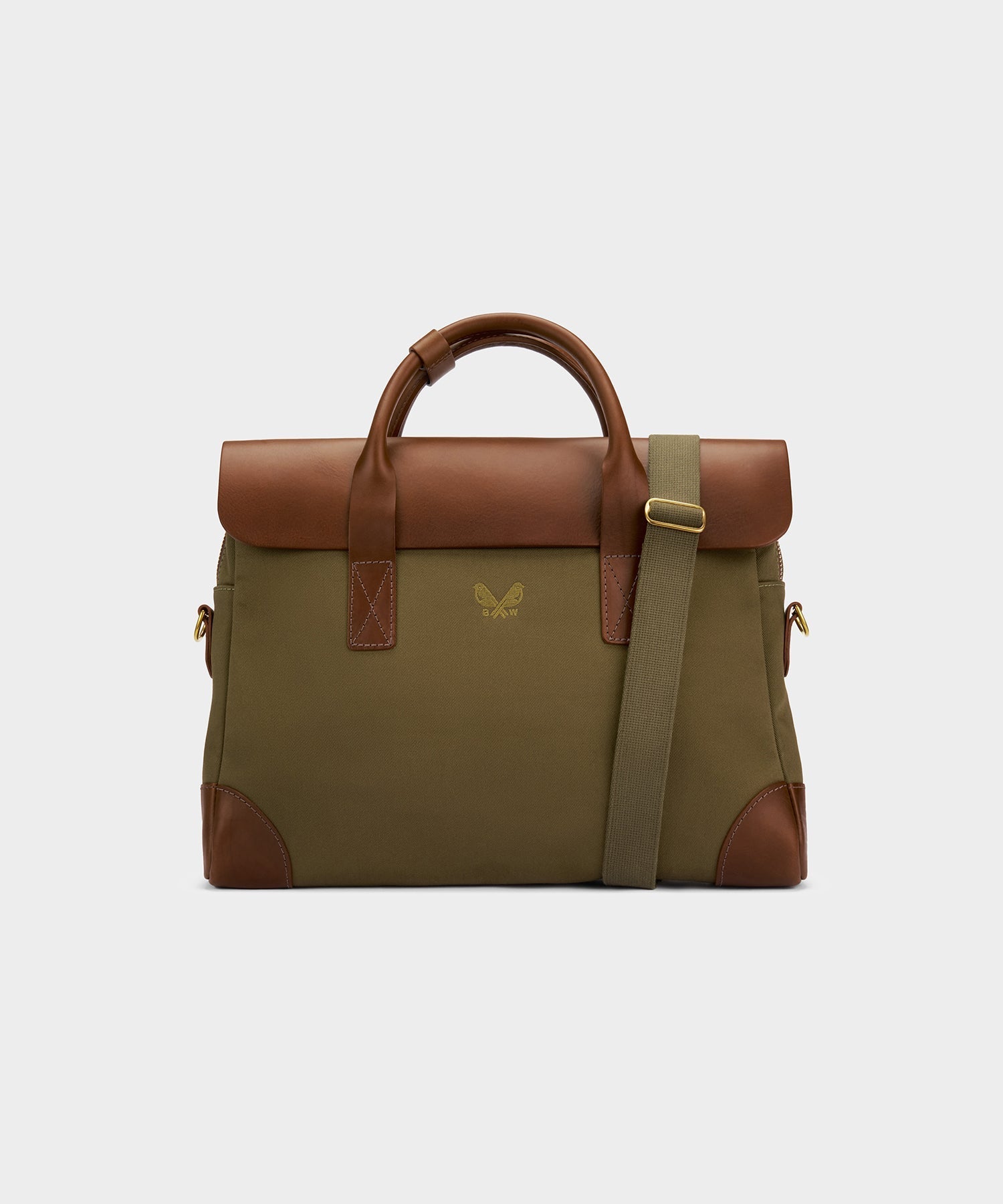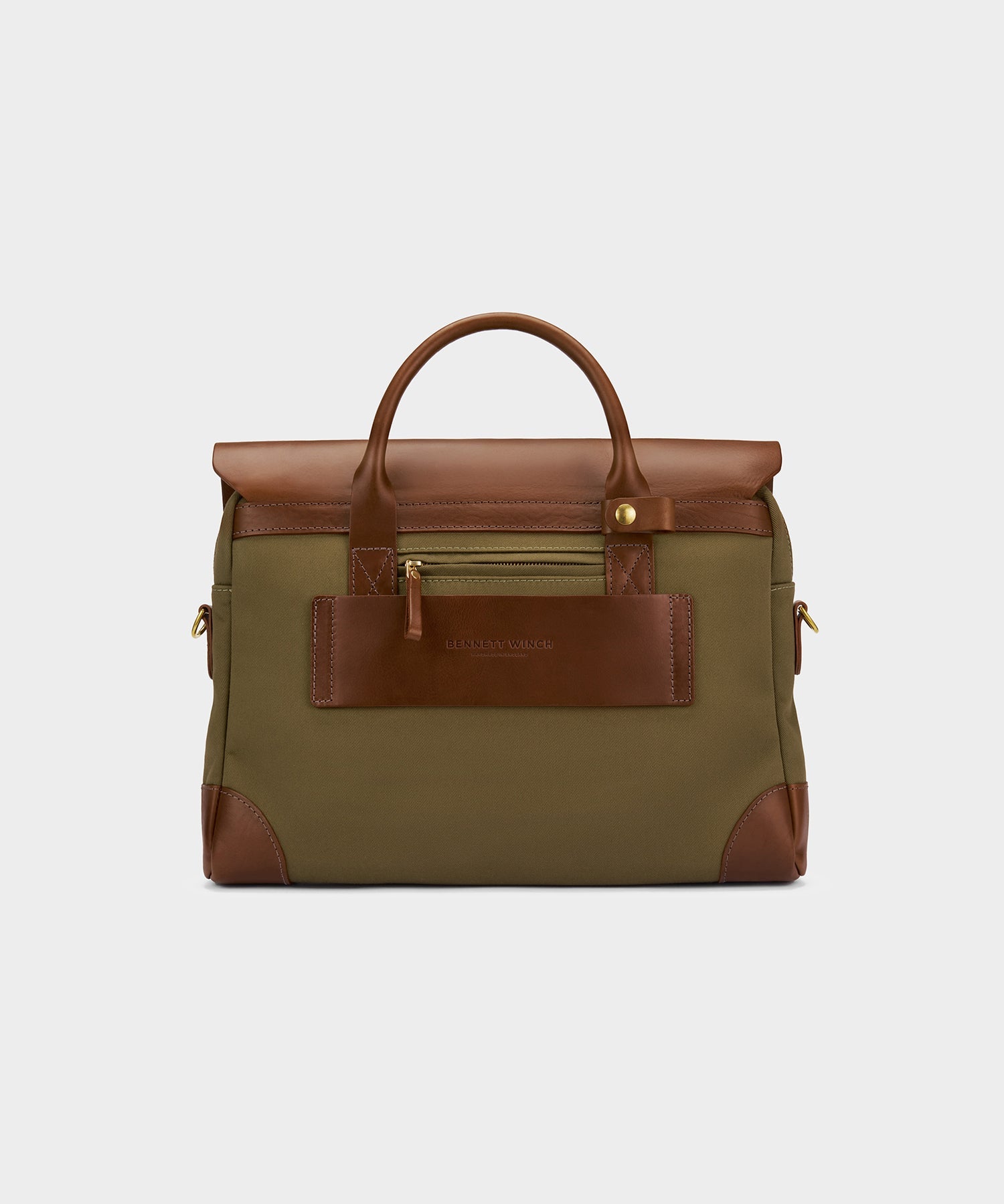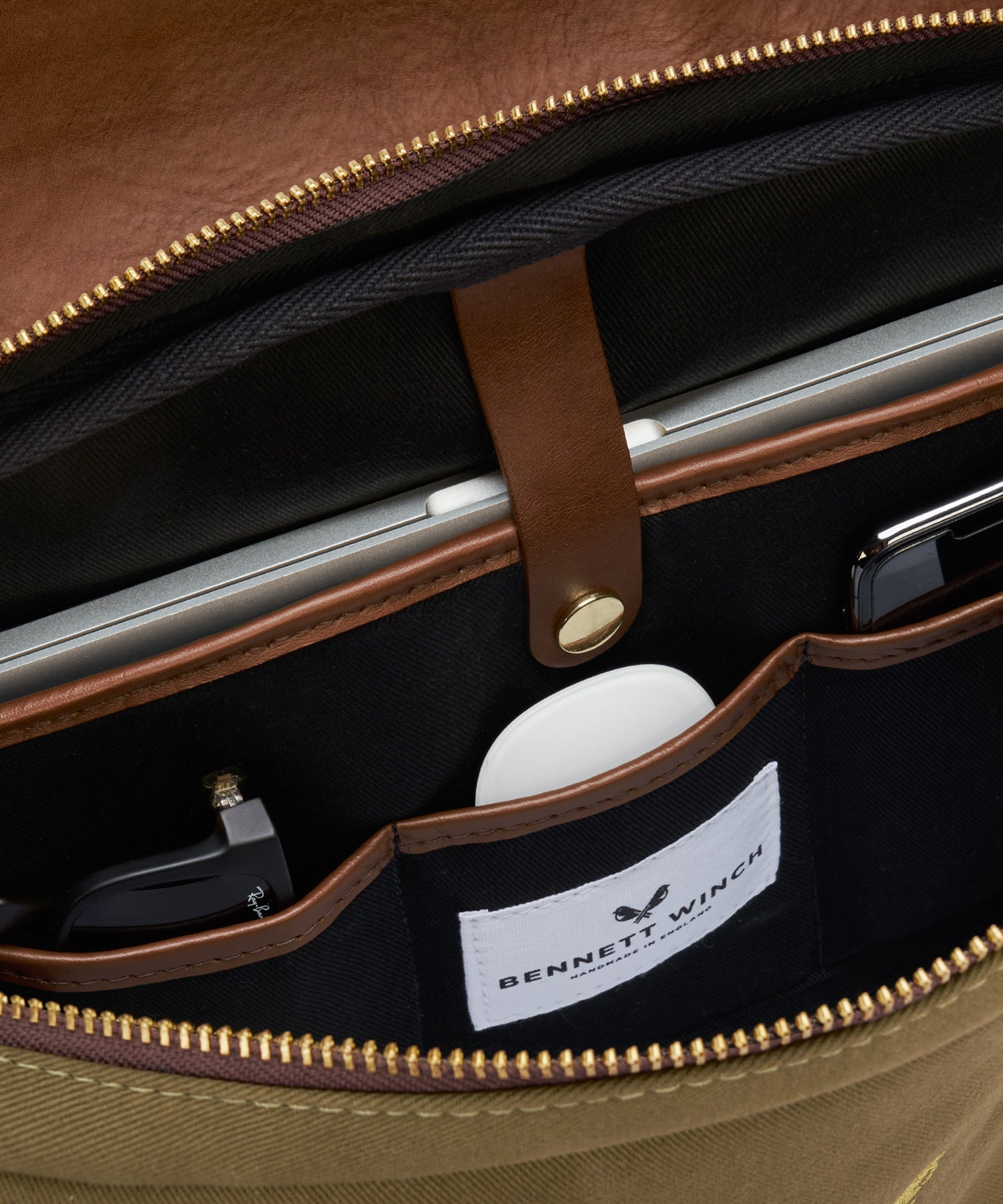 The Brief is built for business on the move. Handmade in England from lightweight, waterproof cotton canvas with leather trim, it offers a smart, understated aesthetic. Despite its slim profile, it’s deceptively spacious. Featuring a fully protected laptop pocket, three internal compartments for organizing devices and valuables, and a concealed front pocket on the reverse for quick-access essentials like your phone or wallet. A leather panel allows for secure attachment to wheeled luggage, while the detachable military-grade cotton strap with solid brass clasps gives you the option to carry it hands-free. Equal parts style and function.