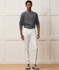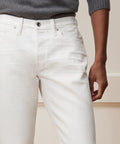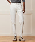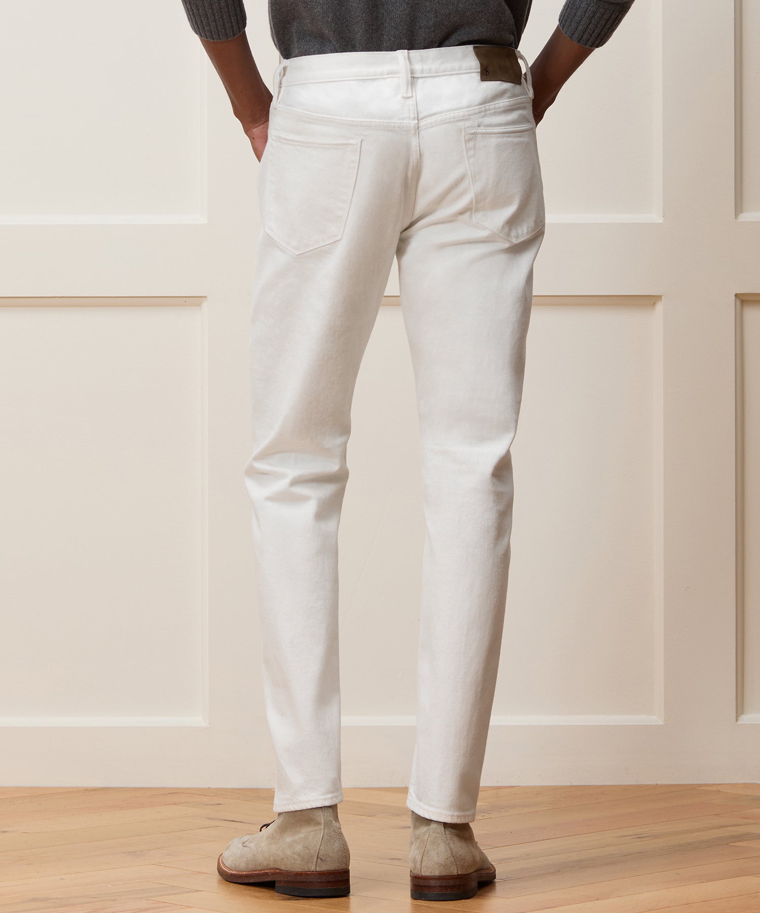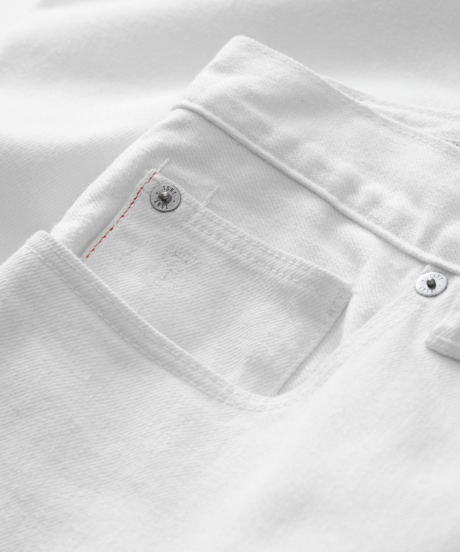Our denim comes in distinct categories (Stretch, Selvedge and Craft), for the same reason that sometimes you want an artisanal sipping whiskey, and others a draft beer. The White Selvedge Denim is part of our Craft offering. This is a limited-edition jean made from imported Japanese denim that comes to us from a boutique mill in the Okayama prefecture where the denim was woven on an old-shuttle loom. And the jean is loaded with quality details including a shank button fly, oxidized rivets, chain-stitched embroidery, a selvedge locker loop inside the back waist and selvedge outseams. So when you turn up the cuff, you’ll see the giveaway ticking on the edge. The only hint of modernity is a 1% lycra component because a hint of stretch can be handy in a warm-weather jean particularly when you might find yourself hopping on a bike for a quick ride to your next event.
